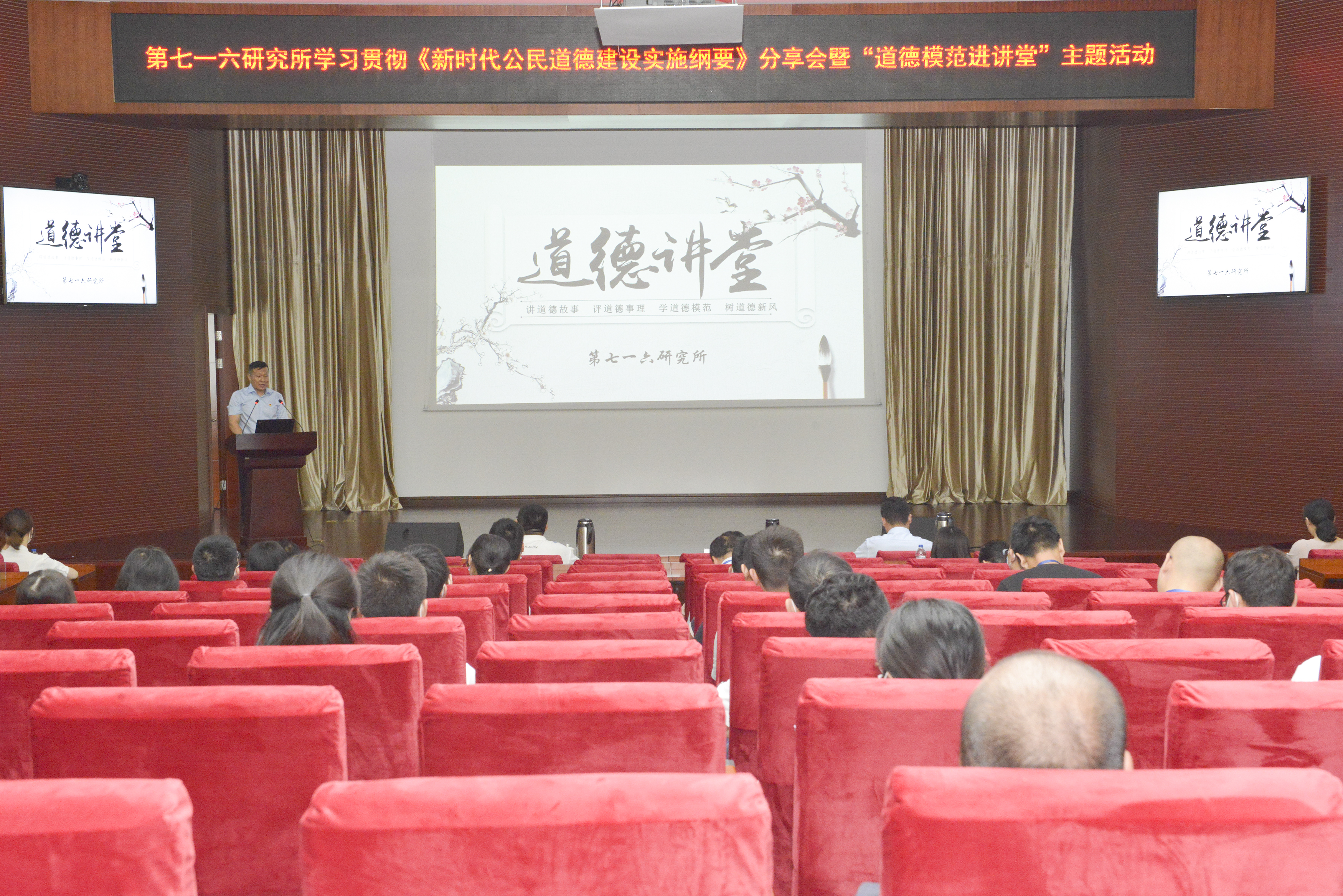 活动中,王飞处长作了《新时代公民道德建设实施纲要》辅导报告会。他着重介绍了《纲要》出台的背景、主要内容、特点及其重要意义,阐释了推进新时代公民道德建设着力点,为七一六所加强道德建设提出了指导性意见。